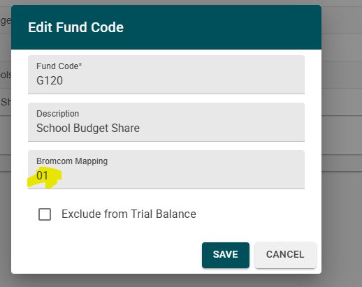 3. If you need to add the fund code also into Bromcom, please go to Modules> Finance>Homepage> Maintenance> Fund codes E.G Fund 3 for G121