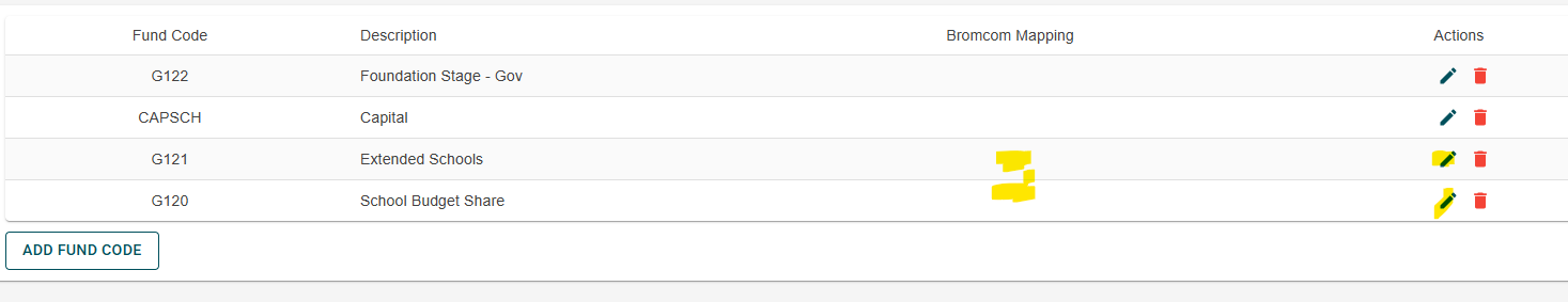 - From the menu on the left at the bottom, click School settings> Click the Fund Codes tab and select the fund code and click pencil button to edit the code