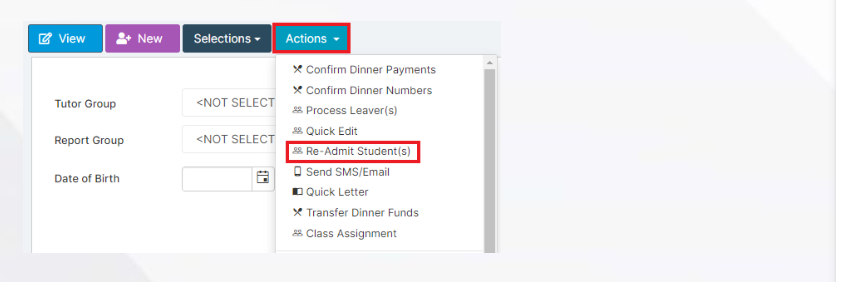 Now select the student/s that you wish to Re-admit and press Actions>Re-admit Student(s).