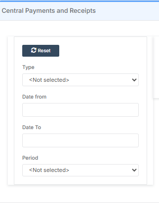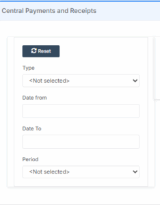 There is a date range filter on the page on the left hand side which can be used to only see central payments and receipts entered during a specific date range.