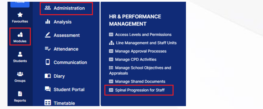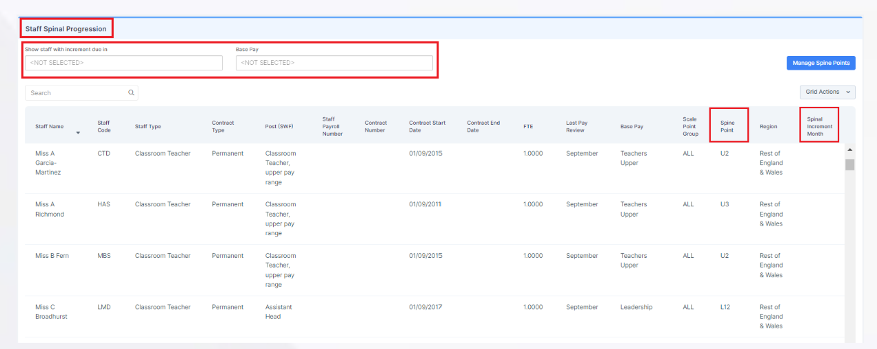 Full details on how to manage spine points in Bromcom can be found below, however please note, even though the spinal progression month is recorded in the contract you will still need to go to Modules > Administration > Spinal Progression for Staff and set the effective date for the increment so this is automatically updated for staff.