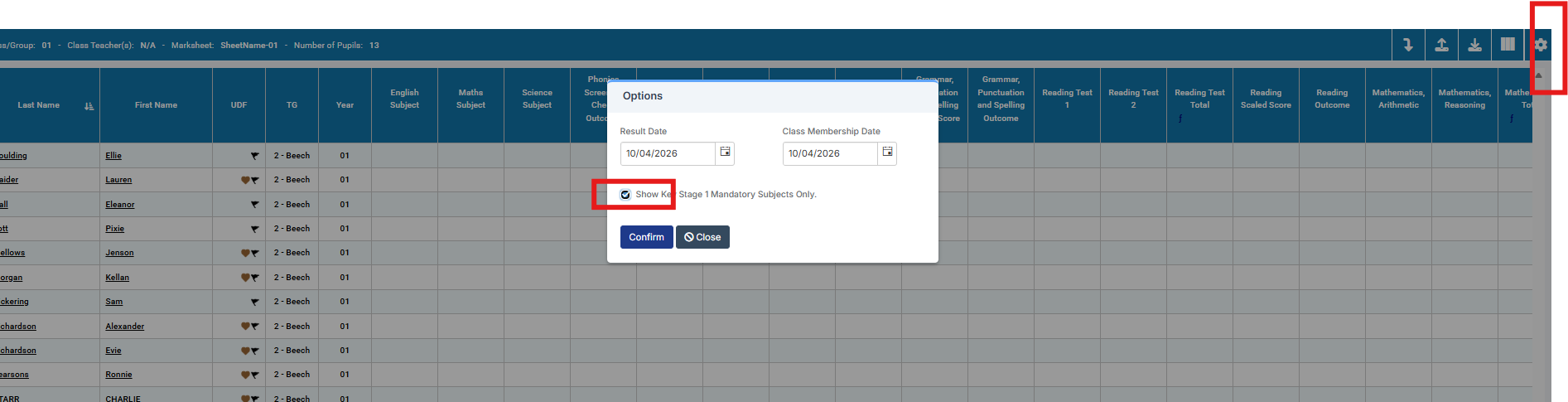 Once the marksheet is open you have the option to only show the two phonics columns by going to the cog on the right hand side and ticking to show Key Stage 1 Mandatory Subjects Only and Confirm.