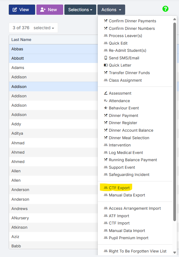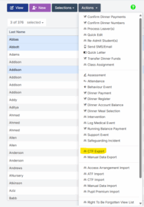 Select the pupils you need to include in the CTF by clicking on them to highlight them in blue, and then use the actions button at the top and choose CTF Export