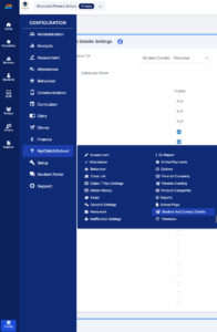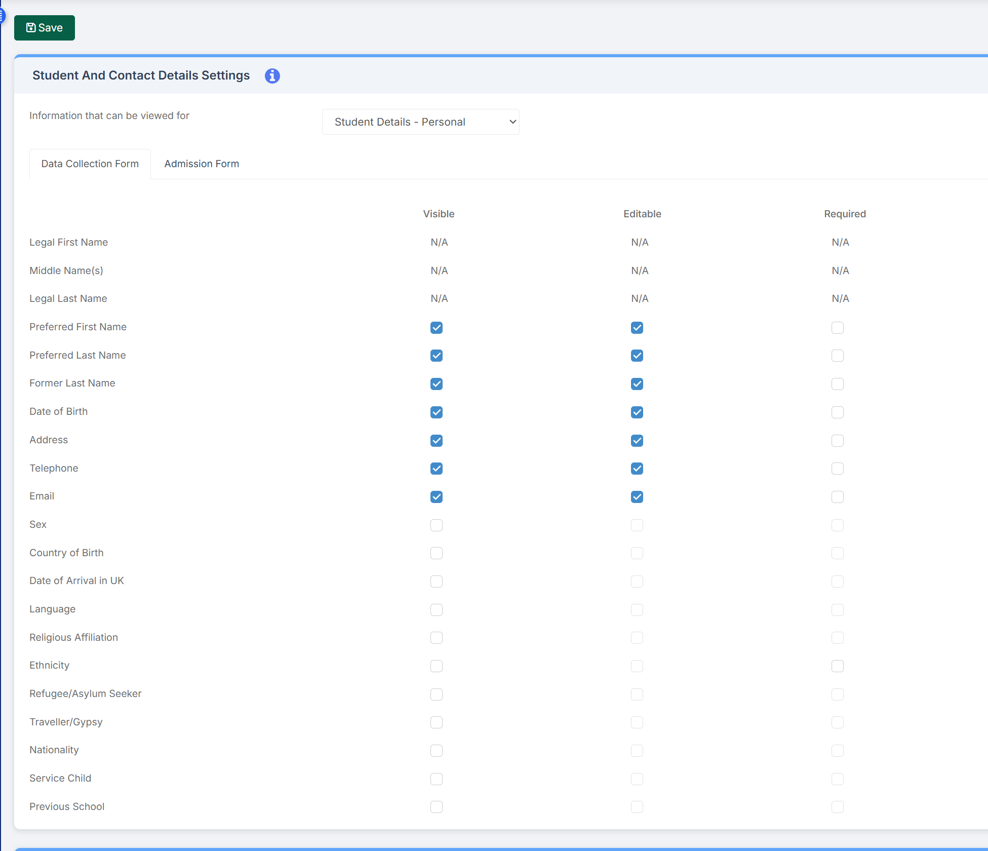 In the Students And Contact Details Settings area you’ll see a dropdown field containing different types of student details, each one of these options will change the details you see in the list below allowing you to configure exactly what parents/guardians can see, edit, and what information you require. You’ll also notice that you can toggle between Data Collection Form, and Admission Form. This means that you can have separate requirements for parents/guardians of existing students, to those of students in preadmission groups.