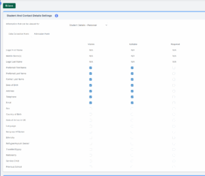 Before you can make something editable and/or required, you must firstly make it visible. Anything you tick as required will make the parent/guardian complete before being able to save the changes. When making changes to this area, it’s important to remember to click the save button in the top left of the screen, any changes you make won’t be applied until after you’ve pressed save.