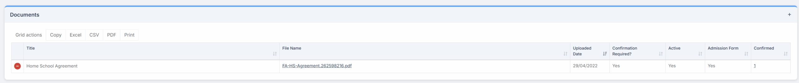 If you scroll further down the page you’ll notice a Documents section, in this area you can attach any documents you might want parents/guardians to have access to whilst completing this process, these documents shouldn’t be student specific as everyone can see them. In the example below the school have uploaded a Home School Agreement allowing parents/guardians to download and complete a copy of the agreement if required.