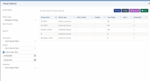 Below the Documents area you’ll notice the Admission Form Permissions area. In this area you will be able to select groups of Students whose parents/guardians will see the admission form for, instead of the regular data collection sheet. In the admission Form Permissions area click the magnifying glass next to the Linked Groups field, this will launch the Group Selector window allowing you to pick which groups of Students you want to assign to the admission form. Using the Group Type field you can filter the list to show you the admission groups, then after selecting a group, click the Done button to add them to the list.