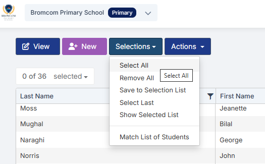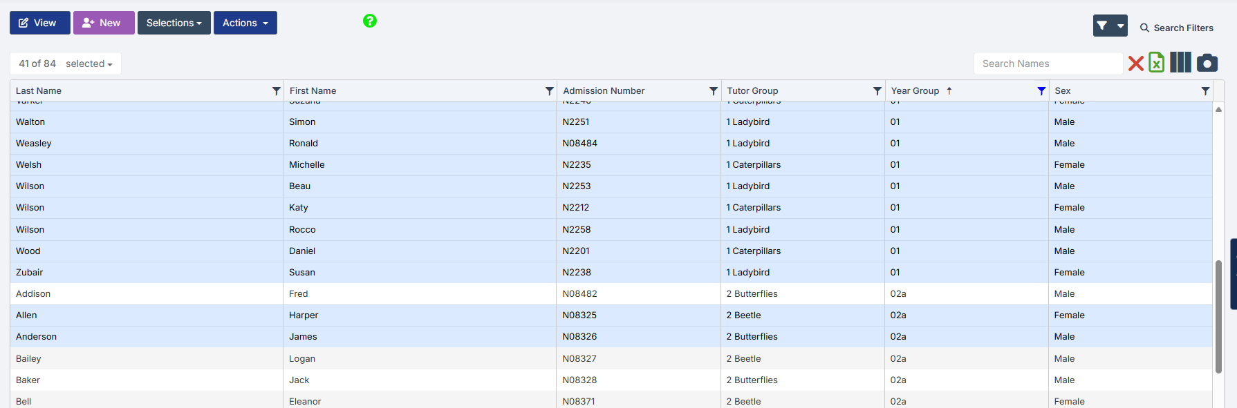 Now use the Selections button at the top to Select All, and all your Year 1 students will now be highlighted.