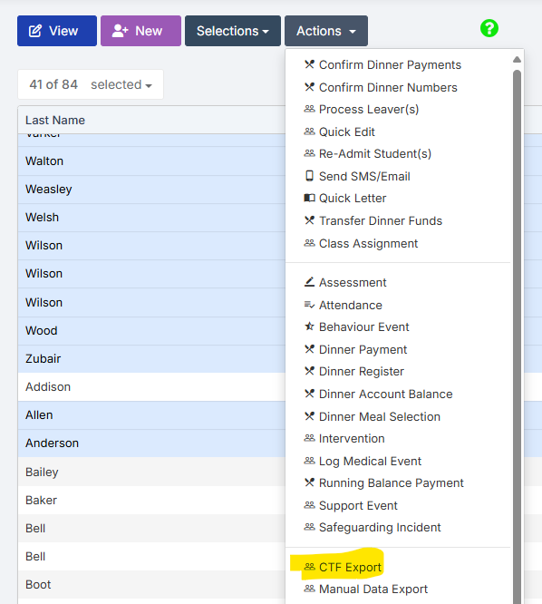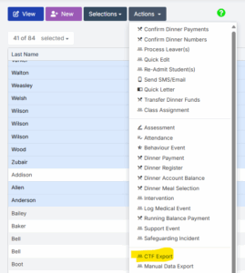Once you have all the Phonics pupils highlighted, you can check the total pupil number on the top left to confirm the correct number, you then click Actions and CTF Export