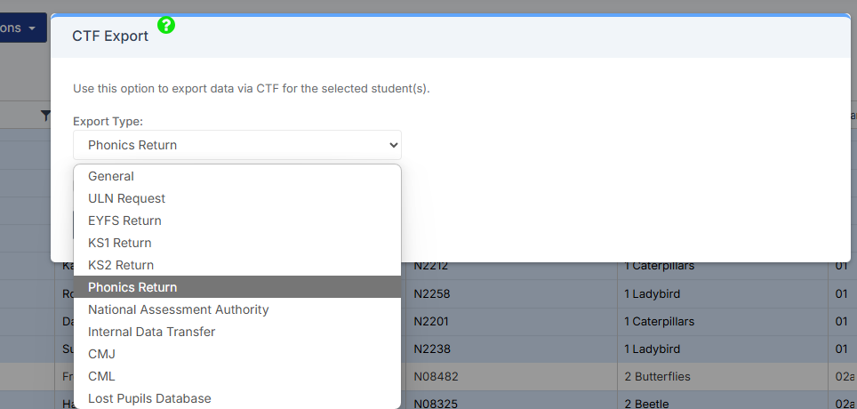 For Year 1 and Year 2 phonics the export type is Phonics Return