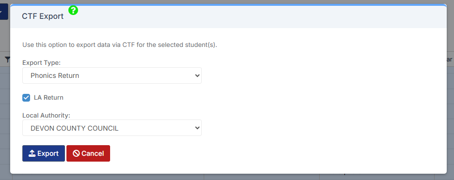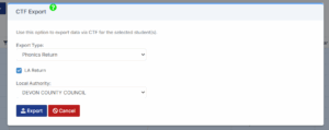 Please check with your LA for CTF requirements. If you are a Devon school- Upload to Devon Transfer (Please note: For Devon this is a combined CTF with all Year 1’s and Year 2 retake pupils in ONE CTF. ONLY INCLUDE YEAR 2’S WHO HAVE RETAKEN PHONICS THIS YEAR)