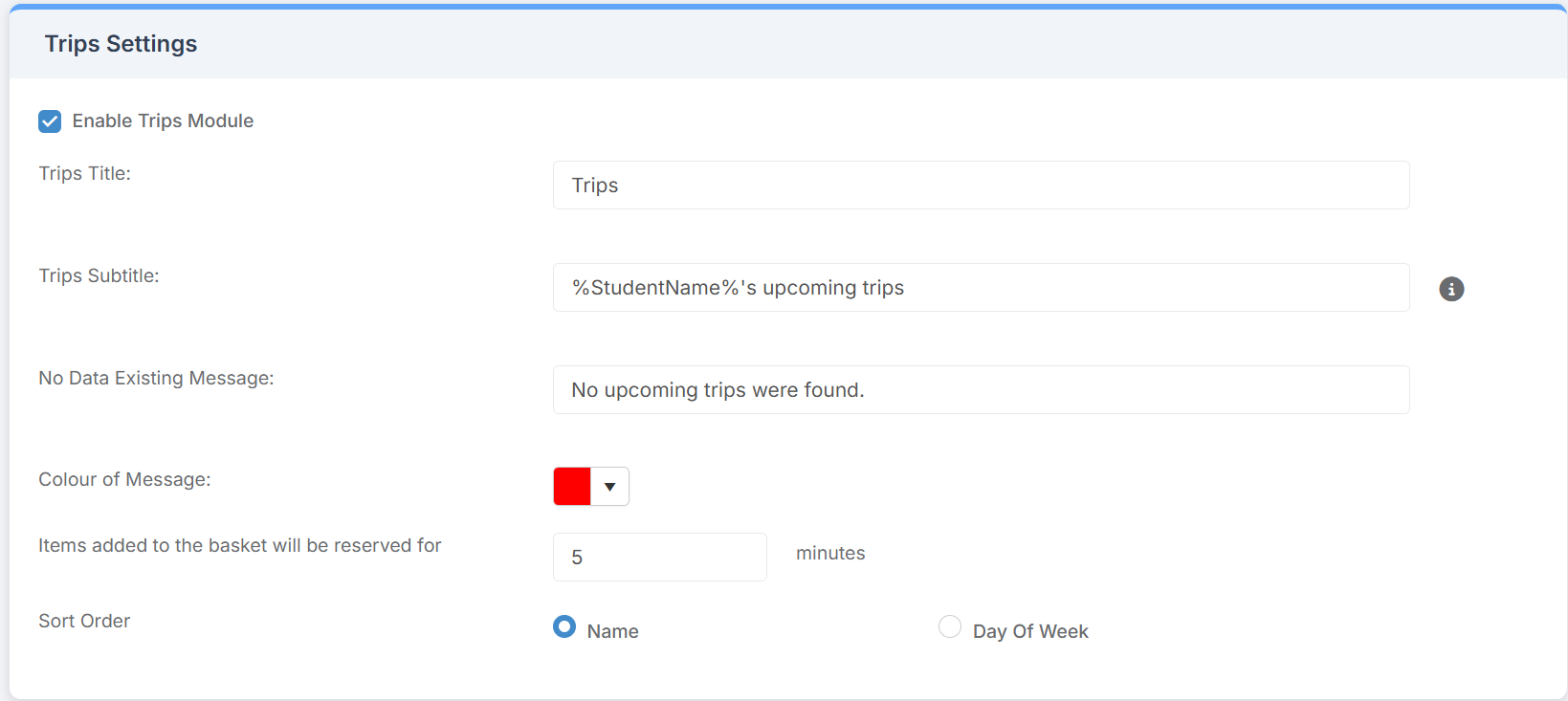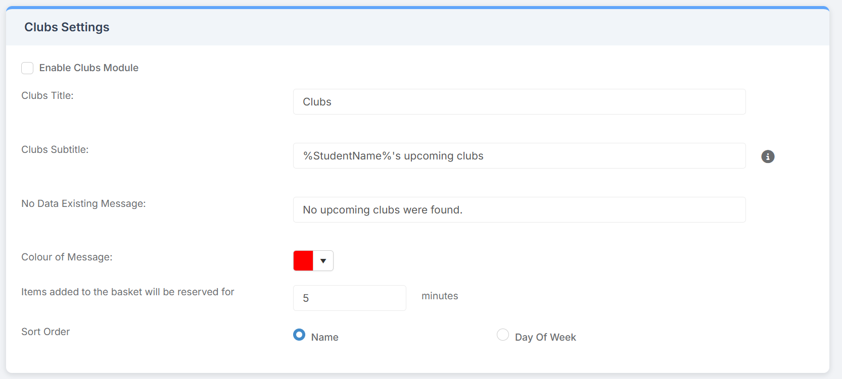 After enabling the clubs module by ticking the “Enable Clubs Module” box at the top of the section, you’ll be able to configure how the page appears for parents/guardians on the App by adjusting the title and subtitle. You can change the message that appears when no clubs are available, as well as what colour the text appears in. As part of this setup area you can also set a time for how long a place is reserved for when a parent adds an item to the basket, the default time is set to 5 minutes. Finally the sort order allows to configure how the clubs will be listed in the App if there is more than one club available.