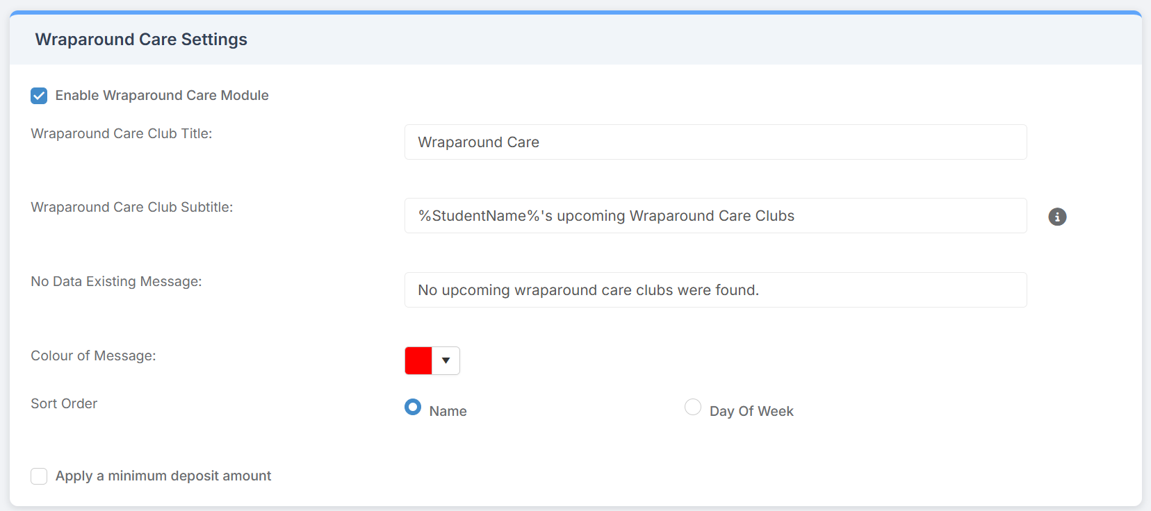 The Wraparound Care settings are mostly the same as the previous two, however you can also apply a minimum deposit amount in this area, this will apply to anything added under the Wraparound Care area