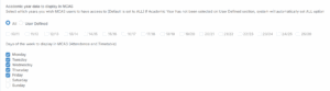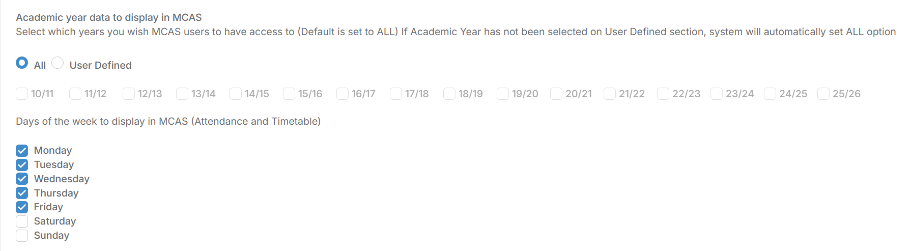 By default MCAS will display data from all Academic Years, however, you are able to define which years you wish to include by ticking the User Defined field, followed by selecting the year(s) you wish to use. This section also allows you to choose which days Attendance and Timetabling information will appear for in MCAS. Days that have been ticked will be included, whilst those without ticks won’t be, by default Monday – Friday will be ticked.