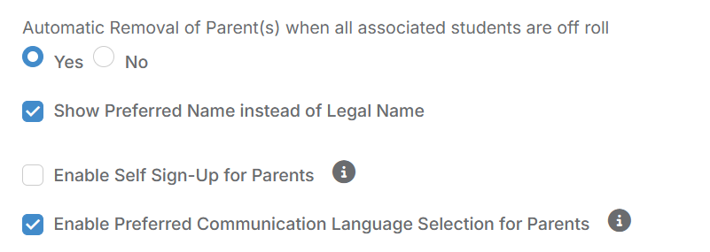 In the next section, you’ll be able to decide whether parents/guardians of students who’ve been taken off roll are automatically removed from MCAS. You can also choose whether MCAS uses preferred names instead of legal names, and whether MCAS will use the preferred communication language for parents/guardians who’s first language isn’t English. You’ll also notice the Self Sign-Up for Parent’s option, this allows parents/guardians to sign-up to MCAS themselves, without having to be invited. This can be useful in some instances, however Bromcom recommend that before using this you make sure that anyone who shouldn’t see student details is dealt with manually.