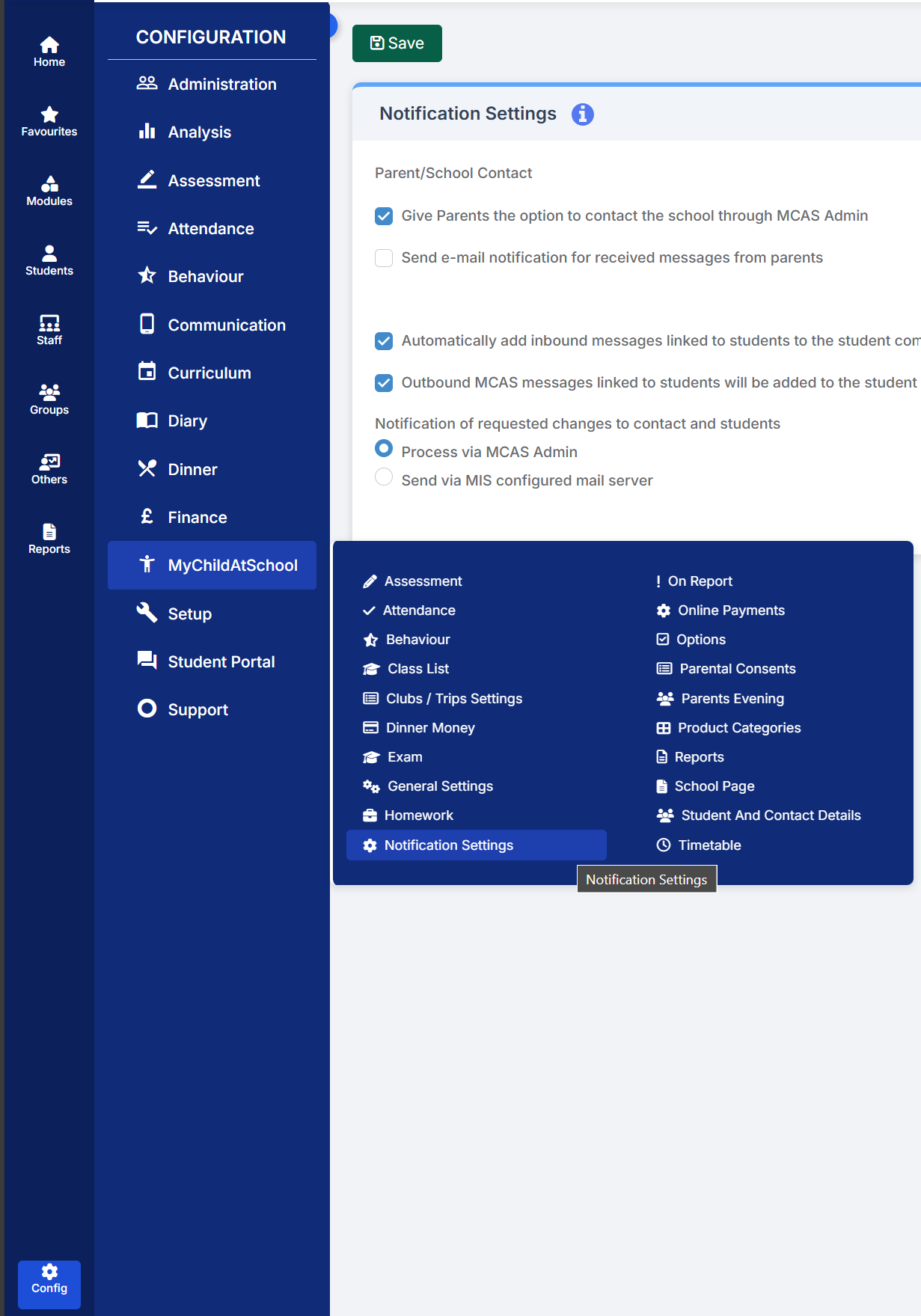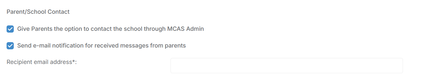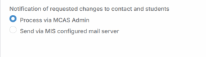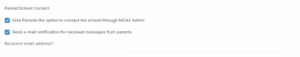 As you enter the Notification Settings area the first option you’ll see is the setting to give parents/guardians access to contact the school through MCAS. Alongside this permission you’ll also see the option to send email notifications to a separate school email address when a message is received via MCAS.