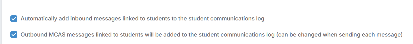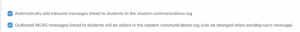Next you’ll see the settings for attaching messages to the communication log of the Student(s) linked to the MCAS user who sent the message. These settings will also allow outbound messages sent by the school to the parent/guardian to be linked to the communication log.