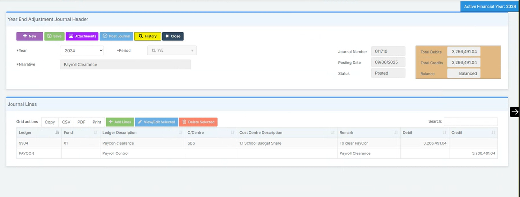 - Line 1 – Select 9904 ledger code to record a debit for the payroll amount for the year as shown in the screen shot below.