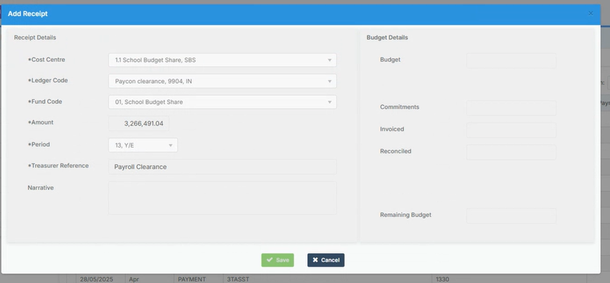 - Record a receipt as shown in the screen shot below to credit the ledger PAYCON with the payroll expenditure for the year.