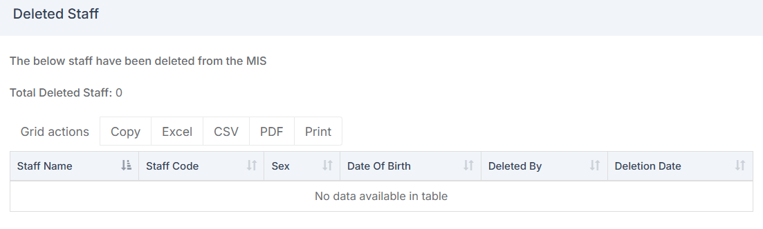 If needed, you can view/access a list of all Deleted Staff on the Staff List page by clicking on Staff > Actions > Deleted Staff. It will show you their information, along with who deleted the account and when.