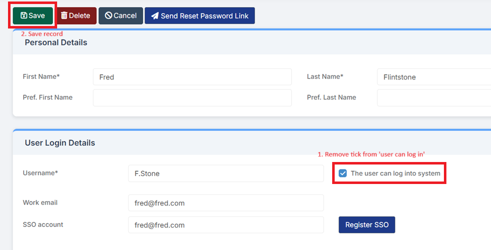 - Remove the tick from ‘The user can log into the system’ tick box under the User Login Details section