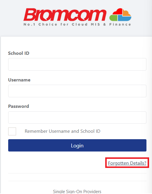 For Bromcom users who have email addresses associated with their account, they can reset their own password by clicking the Forgotten Details link on the Bromcom login page.