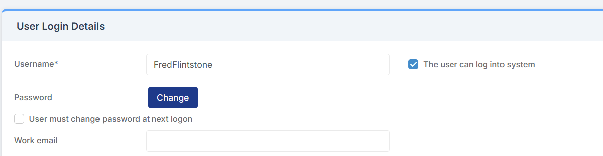 You can click the Change password button to manually set a password for the account, but this is not recommended, and if used, the ‘User must change password at next logon’ box should be ticked to ensure the user sets their own password.