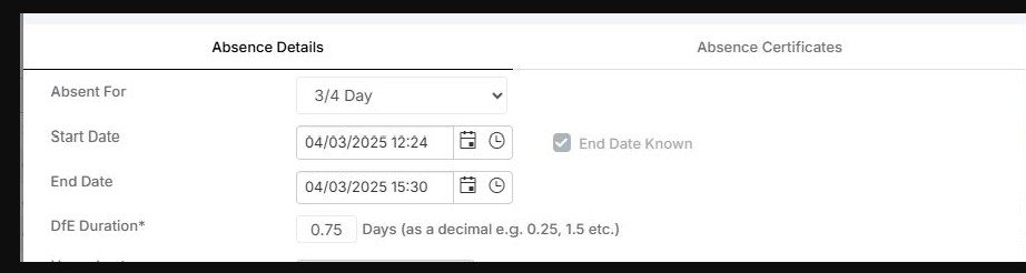 In order to rectify this, you need to set the absence to “1 or more days ” and absence type “continuous days” . You are then able to add a more specific start time and end time.
