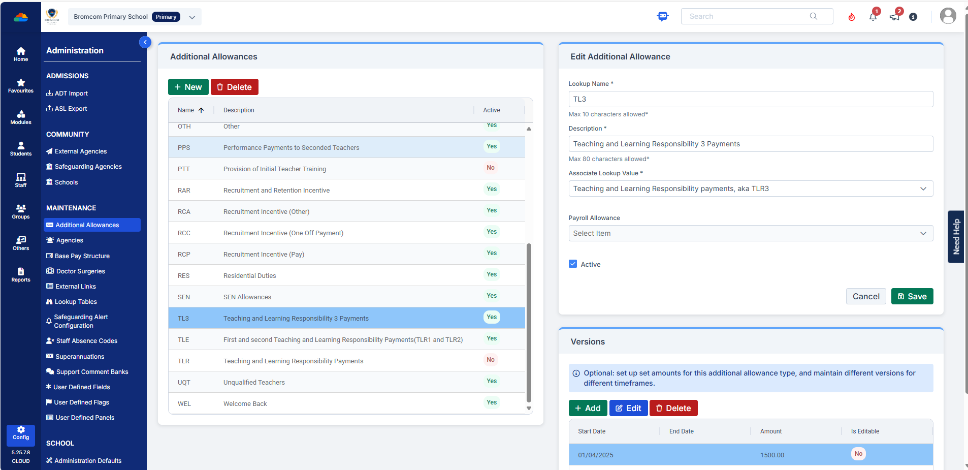 For further information, please also see Administration – Staff: Additional Payments/Allowances – Bromcom