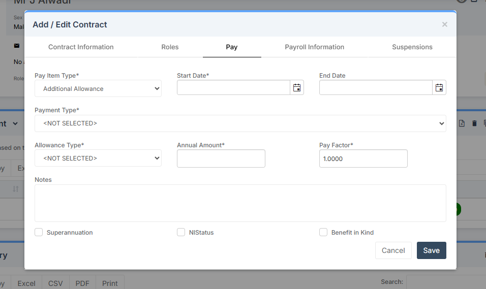 Once you have added the allowance, you will need to update the staff members contract, under the “Pay tab” within the contract with the allowance.