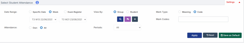 To do this you will need to go to Modules > Attendance > Manage Attendance. From here you can select the parameters for the register that you would like view.