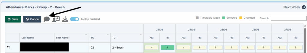 The register will then load. Click into the AM/PM session where you would like to add the comment. Click the Speech Bubble icon to add a comment. A text box will then open, click Add once you have finished typing the comment.