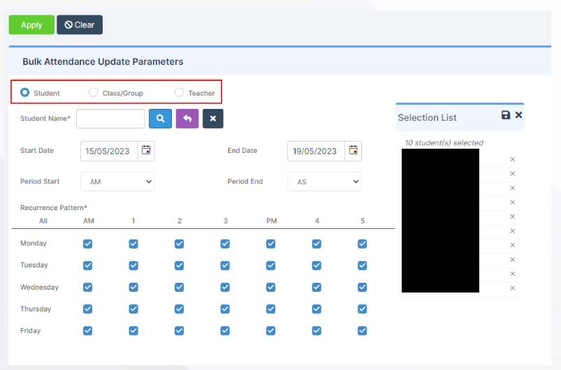 You can then select whether you would like to update attendance for individual Students, Class/Groups or Teachers.