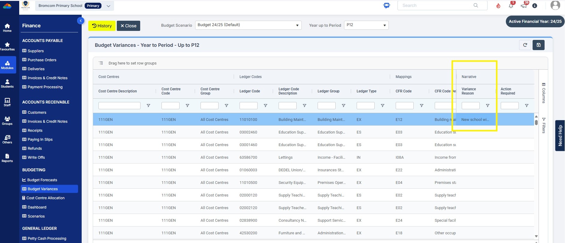Bromcom Finance & Budgeting : How do I enter a Variance reason in Budget Variances
