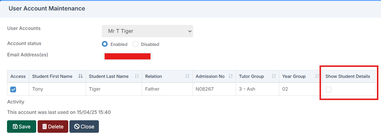 This will open up a screen where you will see the students linked to the contact record. For those you wish to restrict access to, you can either disable MCAS entirely by removing the tick from the Access box, or you can restrict access to the student’s data collection area by unticking the Show Student Details box and clicking save.