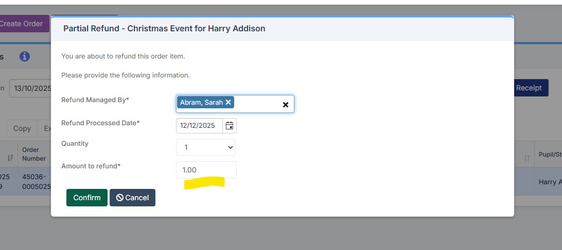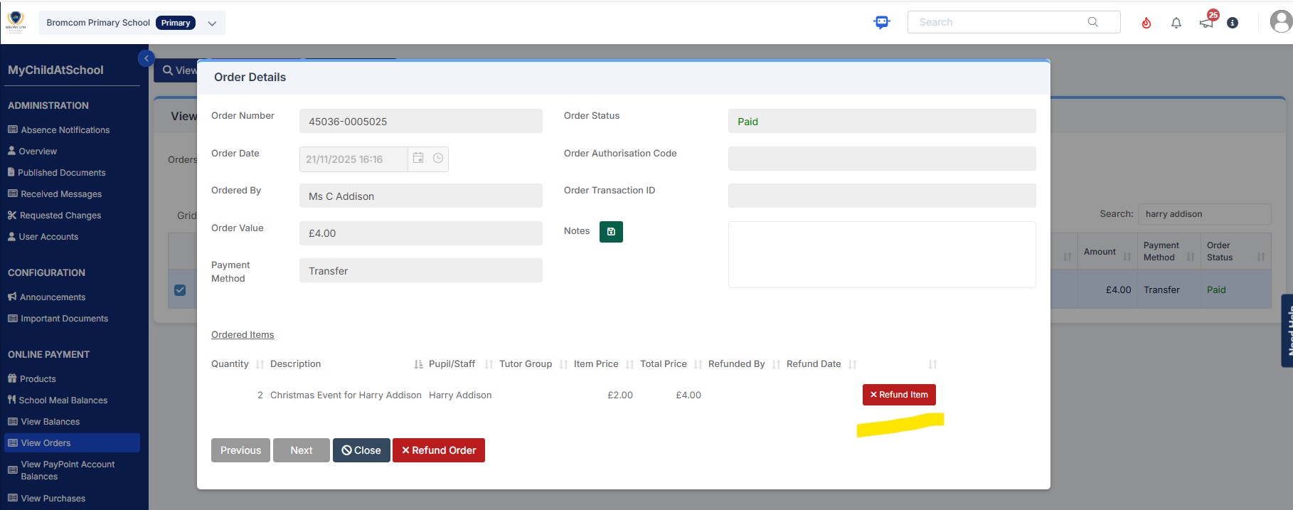 Bromcom: How do I partially refund a “Paid” club pupil order