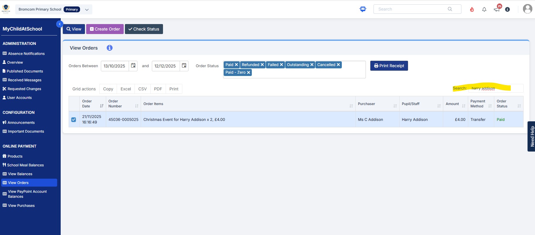 - Amend the dates if required and type the pupils name into the search bar as shown in the example screen shot below and double click the order.