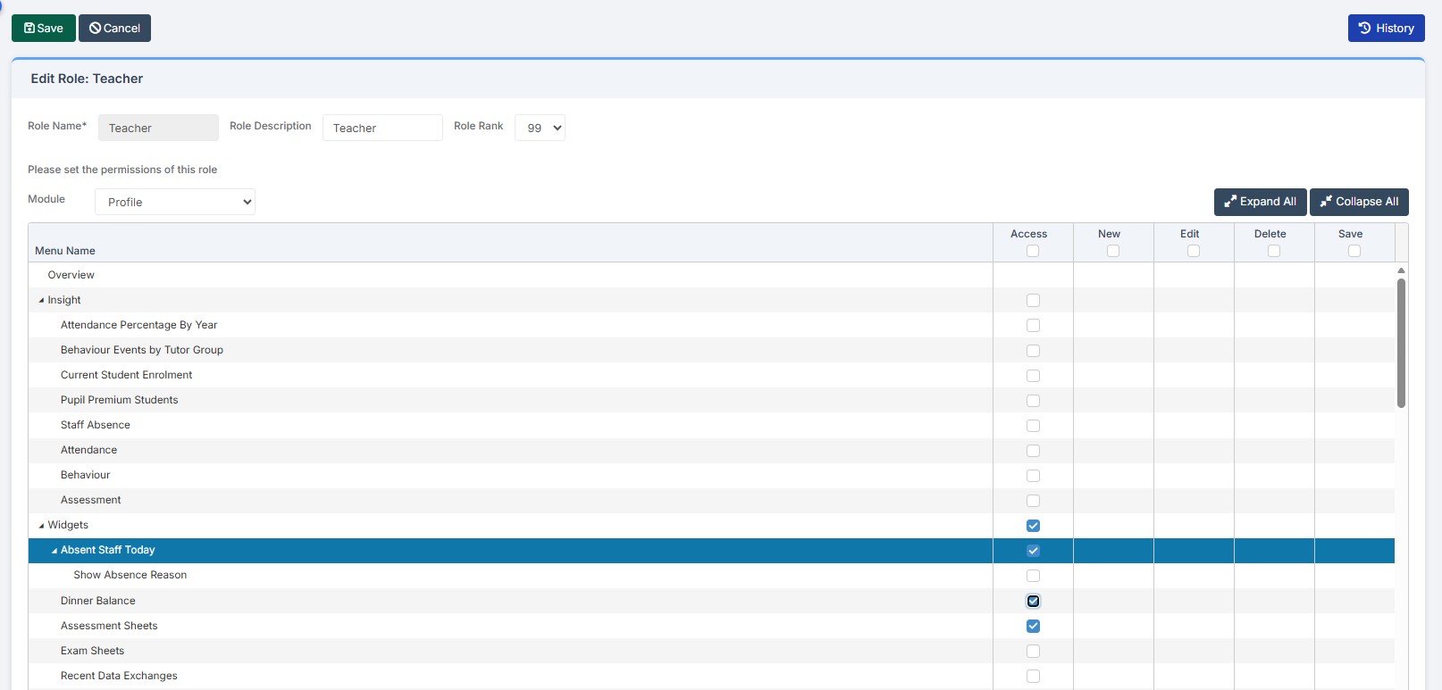 You will then see a list of permission including one for “Dinner Balance” as per the below screen shot. Please then tick the permission under the “Access” column and click the green save button.